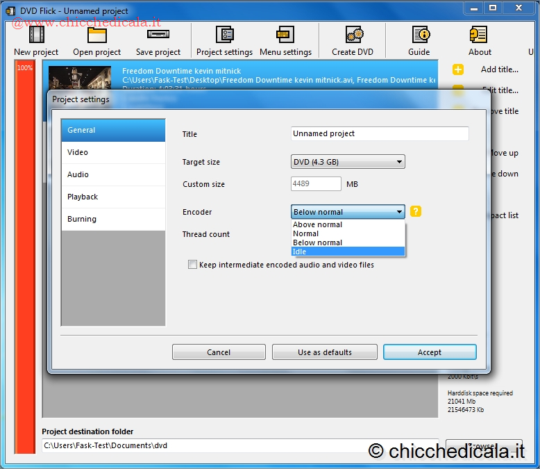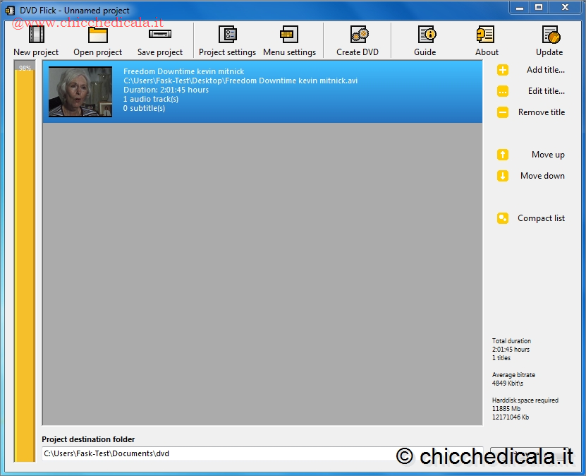 | 9. Rieccovi nella schermata principale di DVD Flick. Nei passi precedenti avete sistemato ogni aspetto del primo filmato incluso nel DVD. Nel caso vogliate aggiungere un secondo video, dovrete semplicemente fare clic su Add title, cercare il nuovo filmato sul vostro disco e ripetere i passi dal 3 al 8. Non inserite troppi video sul disco: tenete sempre presente la barra gialla a sinistra che indica lo spazio rimanente sul DVD. Anche se in questo esempio vedete la soglia al 100% vi consigliamo di non superare il 95%. Quando sarete soddisfatti del contenuto del DVD, fate clic su Project Settings, in alto. 10. La finestra dei settagli del progetto permette di cambiare alcuni aspetti generali del DVD. Nella tabella General, potrete decidere la destinazione del vostro progetto (in “Target Size”). Infatti, potreste anche voler salvare un video su CD o su un Mini-DVD. In questo caso, la capienza cambierebbe e dovreste ricontrollare la barra gialla nella schermata principale di DVD Flick. Consigliamo di lasciare questo menu impostato su “DVD”. Sempre nella stessa finestra, potrete decidere di destinare maggiori risorse del sistema per l’operazione: scegliendo la voce “Idle” o “Below normal” il PC ci metterà molto di più, ma avrà più memoria a disposizione per altri programmi. A voi la scelta, ma se non avete particolari esigenze, lasciate la voce impostata su “Normal”. | ||