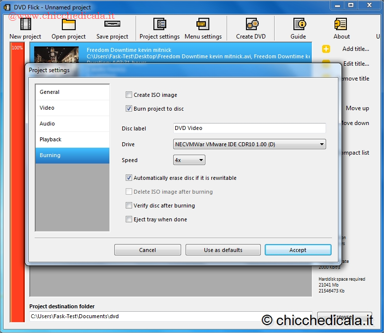 | 11. Fate clic su Audio, nella colonna di sinistra. Dal menu che appare potrete scegliere di diminuire o aumentare il volume della fonte video sul vostro DVD. Se volete modificare questo aspetto, fate clic una o più volte sulle frecce a destra della scritta 100%. Fate ora clic a sinistra sulla voce Burning. In questa finestra potrete decidere se creare semplicemente un’immagine del DVD sul vostro disco fisso (da masterizzare in seguito con un altro programma, come Nero) oppure se masterizzare direttamente il progetto su DVD. Vi consigliamo la seconda possibilità: per farlo, spuntate l’opzione “Burn project to disc”. Nel caso voleste creare l’immagine, \t\tinvece, spuntate l’opzione “Create ISO Image”. 12. Fate clic su Accept per tornare alla finestra principale di DVD Flick. A questo punto, fate clic sul tasto Create DVD, se al passo precedente avete deciso di masterizzare il video. Il programma chiederà di inserire subito un disco vuoto nel masterizzatore. Fate clic su OK e quindi su Yes. Una finestra vi mostrerà lo stato dell’operazione. Una volta finito di elaborare i dati, DVD Flick farà partire in automatico un ottimo programma di masterizzazione (ImgBurn). Il programma vi mostrerà lo stato della masterizzazione. In pochi minuti il processo dovrebbe terminare senza intoppi. Estraete il DVD dal masterizzatore e provatelo su un qualsiasi lettore DVD. Buona visione! | ||