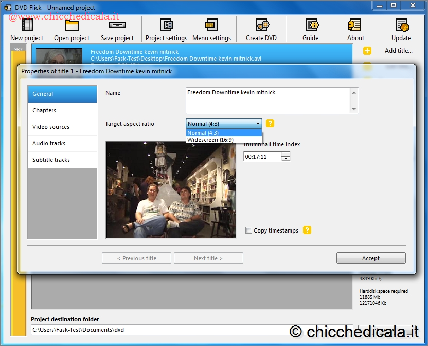 | 3. DVD Flick mostrerà le cartelle del vostro disco fisso in cui cercare il primo video da inserire nel DVD. Una volta trovato, fateci sopra doppio clic. Nella finestra principale troverete una piccola foto presa dal filmato, seguita da alcuni dati tecnici. Noterete, inoltre, la presenza di una barra gialla alla sinistra dello spazio centrale. A seconda di quanto era lungo il video, questa barra indicherà quanta parte del futuro DVD risulterà occupata. Nel nostro esempio abbiamo caricato un video che occupa il 98% del totale. Per modificare i principali aspetti del vostro DVD, fate clic su Edit title. 4. A questo punto vi ritroverete di fronte alla finestra delle proprietà del vostro futuro DVD. In questa fase potrete modificare tutti i principali aspetti della vostra creazione. Innanzitutto, nella tabella General, dovrete scegliere il formato di destinazione. Tenete conto principalmente della forma nativa del filmato: se il video appare già schiacciato e in 16:9, scegliete dal menu “Target Aspect Ratio” l’opzione Widescreen 16:9. Se invece l’immagine del video è tradizionalmente quadrata, scegliete Normal 4:3. | ||