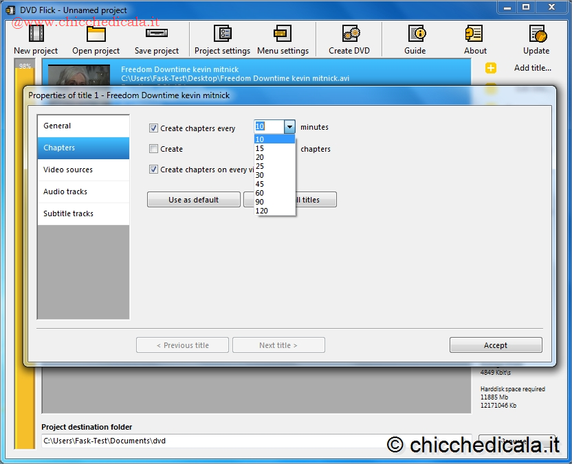 | 5. Spostatevi in Chapters, fate clic su Create chapters every per suddividere il filmato in capitoli. Questi risultano particolarmente comodi per la navigazione, quando si usano\tlettori DVD da salotto. Attenzione: i capitoli non interrompono il filmato in più punti: permettono semplicemente di saltare di un tot di minuti nella visione, avanti o indietro. Per questo, a seconda di quanto è lungo il vostro film, scegliete dal menu un intervallo di tempo adeguato: consigliamo intervalli da dieci minuti. In alternativa, se non volete dividere i capitoli per intervalli di tempo ma semplicemente per numero, fate clic su Create e scegliete il numero complessivo di capitoli. Quest’opzione è particolarmente comoda per i filmati di breve durata. 6. Nella stessa finestra, fate clic su Video sources. Questa nuova schermata vi permetterà di unire più video nella stessa traccia del DVD. Questo potrebbe risultare particolarmente utile per dei film spezzettati su più di un file, oppure per spezzoni di riprese creati con la vostra videocamera. Attenzione, però: per unire due filmati è necessario che gli stessi abbiano le medesime dimensioni su schermo e lo stesso numero di “frame per secondo”. In altre parole: non potrete unire in una stessa traccia due video a casaccio (per mettere più di un video sullo stesso DVD senza unirli, guardate il passo 10). Per unire un secondo video al primo, fate clic su Add. A questo punto cercate la “seconda” parte del filmato sul disco fisso. | ||