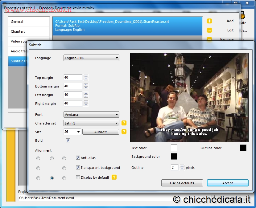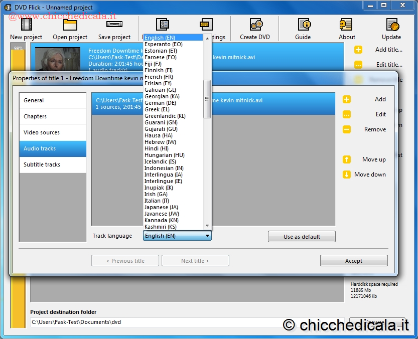 | 7. A questo punto fate clic sulla tabella Audio tracks: la finestra delle proprietà vi presenterà altre opzioni. Questa sezione è completamente dedicata alla gestione di più tracce audio per uno stesso filmato. In pratica, potrete aggiungere più lingue allo stesso filmato, oppure un secondo canale di commento audio a un filmino. Nel caso, fate clic su Add e selezionate sul disco la traccia (anche in MP3) da aggiungere. Poi spuntate la casella alla sinistra del nome della traccia audio e confermate la vostra scelta \t\tfacendo clic su Accept.Tornati nella finestra delle “Audio Tracks”, fate clic sulla tabella Subtitles Tracks. 8. In questa finestra potrete aggiungere altri elementi al DVD. In questo caso DVDFlick dà l’opportunità di aggiungere dei sottotitoli al filmato: per esempio in un filmato inglese potreste aggiungere i sottotitoli in inglese per migliorare la comprensione della lingua e anche dei sottotitoli in italiano per coloro che non masticano la lingua britannica. Se volete aggiungere dei sottotitoli, dunque, fate clic su Add e cercate sul vostro disco il file che li contiene (solitamente con estensione “.sub” o “.srt”). Accettate la selezione e, tornati nella finestra dei sottotitoli, selezionate quelli appena aggiunti e quindi fate clic su Edit. Nella finestra che apparirà potrete scegliere il nome della lingua da associare ai sottotitoli grazie a un menu a tendina (Languages) e la posizione degli stessi sullo schermo. Una volta soddisfatti del risultato, fate clic su Accept. | ||