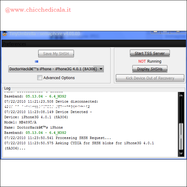 | 3. Dopo che ha riconosciuto il dispositivo clicchiamo sul pulsante “Save My SHSH“, dopo qualche secondo TinyUmbrella avrà salvato il nostro ECID sul server di Saurik e sul nostro Computer, e inoltre avrà modificato il file degli host che reindirizzera iTunes al server di Saurik invece di quello della Apple quando cercherà l’UDID per eseguire il Downgrade. 4. Un ulteriore controllo non guasta mai, clicchiamo su “Display SHSHs” e si aprirà una finestra in cui ci illustrerà per quali Firmware abbiamo l’ECID salvato. Ora possiamo aggiornare tranquillamente sapendo che possiamo tornare indietro in ogni momento! | ||