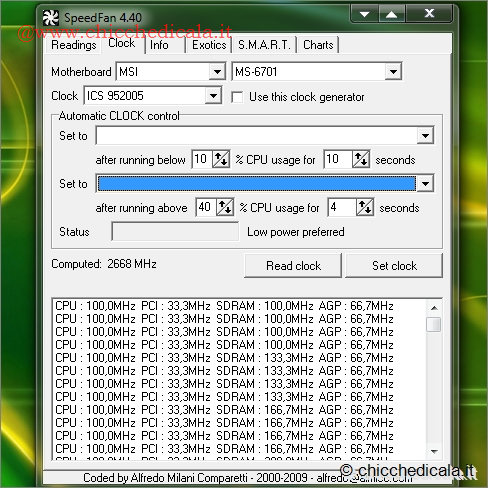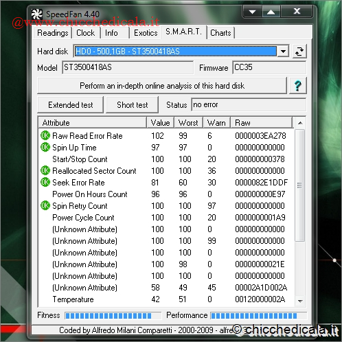 | 3. Spostatevi nella scheda Clock. Viene immediatamente aperto un messaggio di avviso: se nella pagina principale sono indicati una scheda madre o un chipset errati, potrebbero determinarsi danni. Continuando è possibile impostare (a proprio rischio) la velocità del processore e verificare (al centro) la velocità calcolata del sistema. 4. SMART è forse l’applicazione più interessante, e certo la più articolata del pacchetto. Un esperto vi potrà trovare dati fondamentali per valutare lo stato di salute dell’ hard disk. Per i meno “smanettoni” risulta comunque utile conoscere la versione del firmware, per provvedere eventualmente a un aggiornamento. | ||