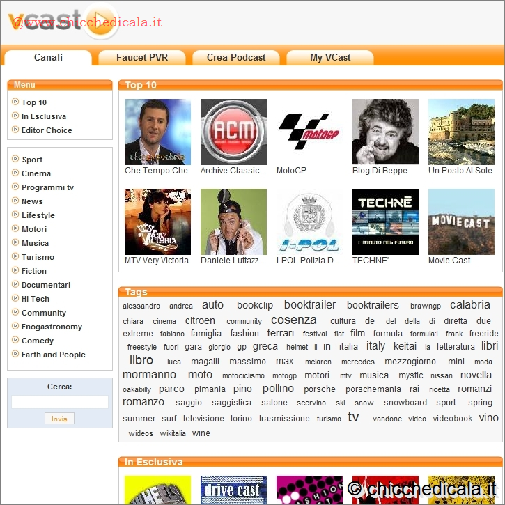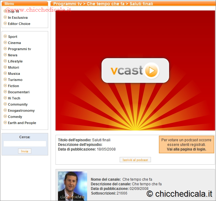 | 3. Una volta iscritti, familiarizzate con il servizio dando un’occhiata alle categorie dei podcast. Nella parte centrale dell’home page trovate la classifica dei video più visualizzati. Più in basso, oltre ai contenuti forniti in esclusiva da VCast, ci sono le aree tematiche in base alle quali sono suddivise le clip: Sport, Cinema, Programmi TV, News, Life Style, Motori e altre. 4. In ogni sezione sono elencati i canali, o meglio i link, che permettono di accedere all’area in cui sono raccolti tutti i video di una trasmissione televisiva, oppure quelli caricati su un blog o quelli trasmessi da una Web-TV. Per esempio, se selezionate “Che tempo che fa”, accedete alla pagina contenente le clip estratte dalla trasmissione condotta da Fabio Fazio. In questa sezione, come in tutte le altre, non trovate i podcast con la registrazione dell’intero programma, ma solo degli estratti. Quelli di “Che tempo che fa” si riferiscono ai (cosiddetti) “Saluti finali” di Luciana Littizzetto, e alle sue gag con il conduttore. Facendo clic nel riquadro a centro pagina, visualizzate l’intervento più recente della comica torinese. | ||