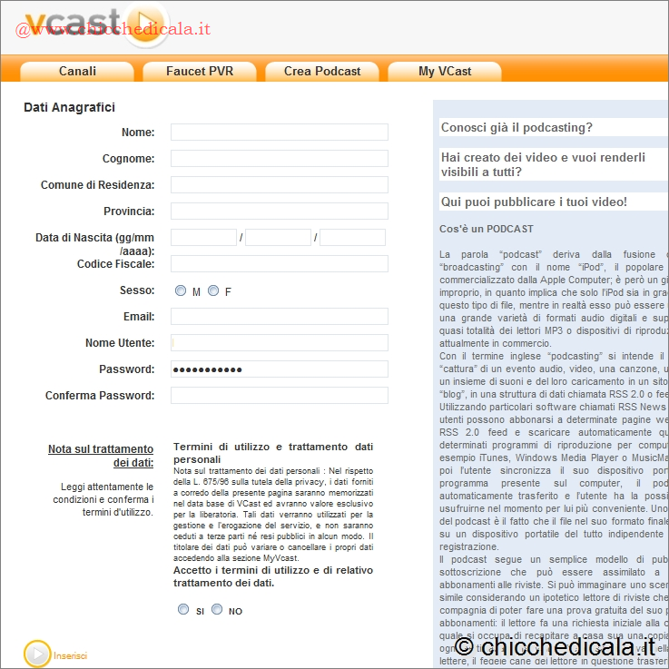 | 1. Per utilizzare il servizio VCast, occorre in primo luogo creare un account. Collegatevi all’indirizzo www.vcast.it, selezionate il link Register presente in alto a destra e compilate tutti i campi nel form di iscrizione. 2. Ricordatevi di tenere sottomano anche il codice fiscale, perché dovrete inserire anche questo dato personale. Selezionate poi la casella Sì per accettare i termini di utilizzo del servizio e quelli relativi al trattamento dei dati personali, quindi fate clic sulla voce Inserisci. | ||