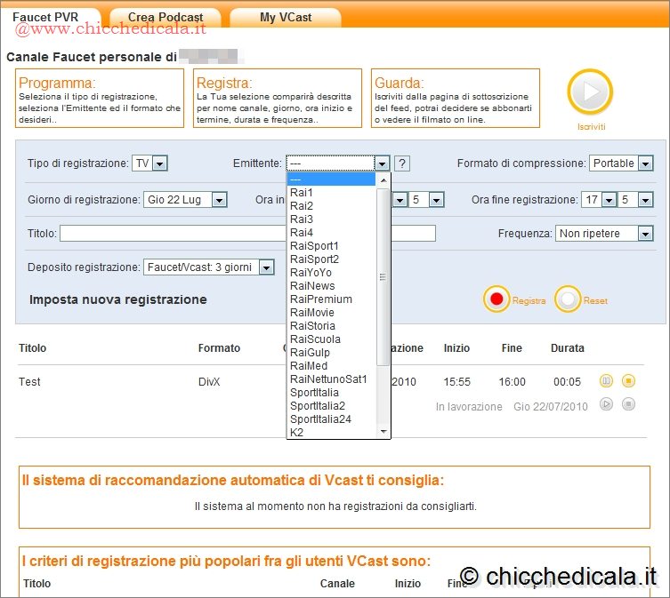 | 5. Sotto il player video integrato nella pagina, trovate anche la lista dei podcast pubblicati nel passato. Se desiderate essere aggiornati sui contenuti di un canale particolare, non dovete fare altro che selezionare il pulsante Iscriviti per inserire così la relativa pagina Web di VCast nell’elenco dei preferiti del browser. 6. VCast non mette a disposizione solo un elenco dei più interessanti podcast presenti on-line, ma permette anche di registrare le trasmissioni televisive. Il servizio funziona in pratica da PVR (Personal Video Recorder): consente di stabilire l’orario e la durata della registrazione del programma che volete, e di scaricare il relativo file nel PC in modo da vedere il programma tramite il vostro player multimediale.Per utilizzare questo servizio, selezionate il link “Faucet PVR”. | ||