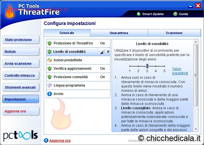 | 3. Andate in Impostazioni e spostatevi su “Livello di Sensibilità”. Sulla destra trovate un cursore, grazie al quale è possibile definire le aree di intervento del sistema di protezione. Solitamente il livello proposto in automatico è sufficiente per sentirsi al sicuro, senza appesantire il sistema: si tratta di una giusta via di mezzo tra profondità di scansione e velocità operativa. 4. Premendo il pulsante Verifica gli aggiornamenti verrà avviata la comune procedura di aggiornamento del programma. Nonostante si tratti di un software gratuito, le versioni si susseguono in maniera regolare e costante, garantendo sempre una buona protezione. L’aggiornamento può essere reso automatico. | ||
