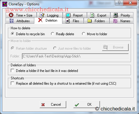 | 3. Prestate grande attenzione alle varie finestre delle opzioni. La prima, Attributes, consente di scegliere le caratteristiche dei file da sottoporre la scansione. 4. Deletion è una finestra da maneggiare con cura: vi si decide cosa fare dei file duplicati. In automatico è selezionato il trasferimento ma, se si vuol garantire un margine di sicurezza, conviene spostare (Move to a folder) il materiale da riciclare in una cartellina ad hoc. | ||