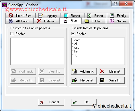 | 5. È possibile anche definire liste di file da cercare ed, eventualmente, da escludere. In default sono proposte categorie (come “.exe” o “.dll”) che non è necessario esaminare (tranne in particolari casi).Conviene lasciarli selezionati. 6. Nel contempo, potremo sempre escludere alcune cartelle; tanto per fare un esempio, una contenente file amministrativi: una cancellazione frettolosa o inopportuna potrebbe essere disastrosa! Liste particolari, create per usi specifici, possono essere salvate per futuri utilizzi. | ||