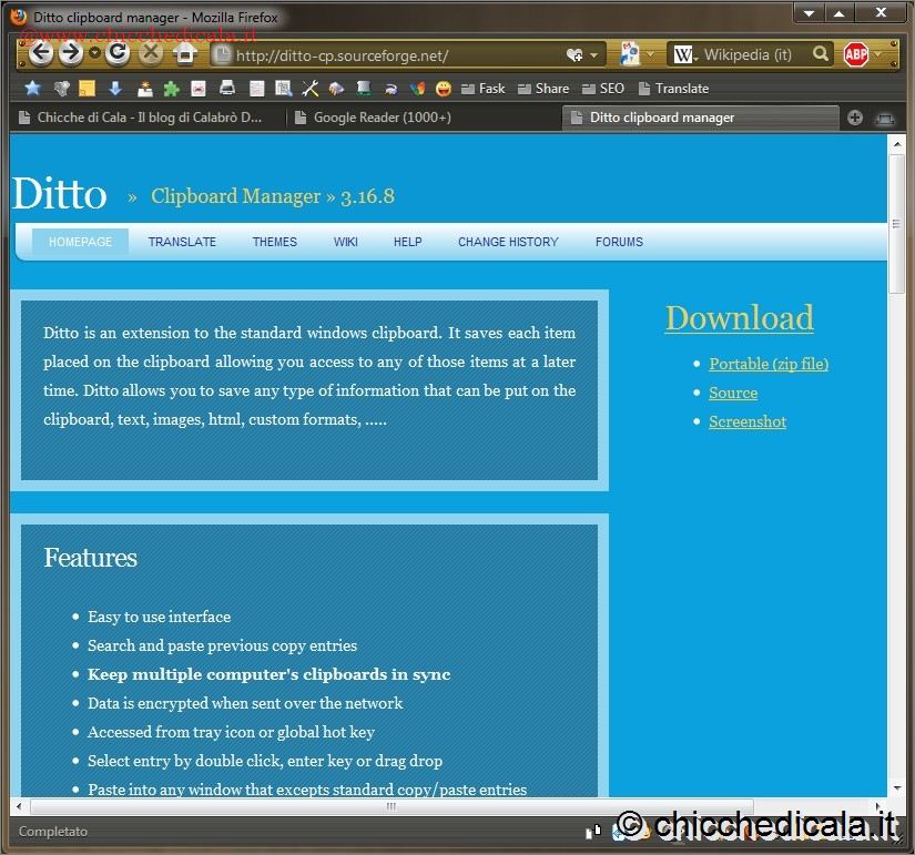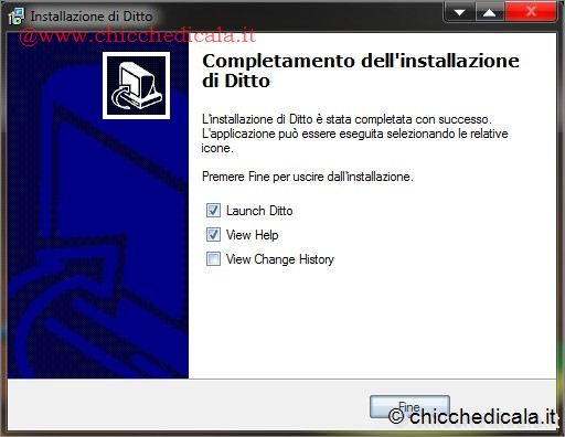 | 1. Innanzitutto è necessario scaricare il programma gratuito dal sito ufficiale. In pochi istanti vi ritroverete \t\tnella pagina principale del sito, in lingua inglese. Per scaricare il programma sarà necessario un clic sul collegamento Download, in alto alla destra. Dopo un breve caricamento, vi verrà richiesto di salvare o aprire il file in questione. Scegliete di aprire il file e attendete. 2. Se avete seguito correttamente il primo passo, alla fine dello scaricamento partirà automaticamente l’installazione guidata del programma. Per prima cosa vi verrà chiesta la lingua da utilizzare durante la fase di installazione: scegliete “Italiano” e fate clic su OK. Nella schermata successiva, fate clic sul pulsante Avanti. Vi verrà chiesta la cartella di destinazione del programma. Se non avete particolari esigenze, confermate quella di default e fate clic su Avanti. A questo punto potrete decidere se selezionare o no l’esecuzione automatica di Ditto all’avvio del sistema. Consigliamo di lasciare selezionata l’opzione. Fate clic su Avanti. Dopo una breve installazione dei file, il programma sarà pronto per essere utilizzato. Togliete la spunta dall’opzione View help e fate clic su Fine. | ||
