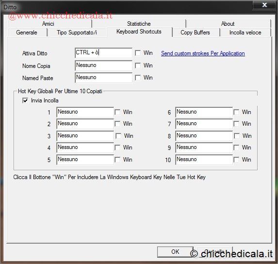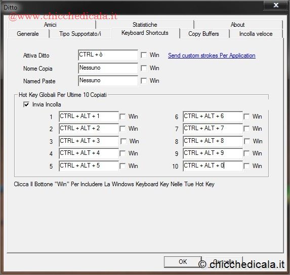 | 9. Nel passo 8 abbiamo visto come incollare una selezione di appunti in un documento, utilizzando la finestra principale di Ditto. Ma potreste utilizzare delle combinazioni di tasti per incollare le varie selezioni, senza dover aprire ogni volta la finestra del programma. Per farlo, tornate nella schermata delle opzioni di Ditto (come visto nel passo 3).Fate clic sulla sezione Keyboard shortcuts. Nella parte in basso di questa finestra si trovano una decina di campi vuoti: corrispondono alle combinazioni di tasti da usare per incollare velocemente le ultime dieci selezioni negli appunti di Ditto. 10. Per assegnare una combinazione di tasti a una delle ultime dieci “copie” degli appunti, andate sul campo vuoto corrispondente (quello indicato con 1 incollerà l’ultima selezione di appunti, quello con 2 la penultima e così via…) e fate clic. A questo punto premete sulla tastiera una combinazione di tasti che volete associare a questa selezione. Per semplicità, nel nostro esempio abbiamo assegnato al primo campo i tasti CTRL+ALT+1, al secondo CTRL+ALT+2 e così via. Una volta compilati i vari campi, fate clic su OK.Tornate nel Blocco note e provate a premere le varie combinazioni di tasti appena create. Come vedrete, gli appunti associati ai comandi verranno incollati automaticamente. | ||