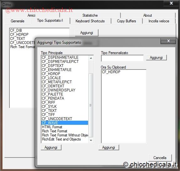 | 5. Inizialmente Ditto non è in grado di tenere in memoria tutti i tipi di “copia” effettuati sul computer: ricorda solo i dati di testo. Niente da fare, per esempio, con selezioni di immagini. Per includere altri tipi di copia nella memoria di Ditto, basta andare nella sezione Tipo supportato nella schermata delle opzioni. Una volta lì, fate clic sul pulsante Aggiungi e, dalla lista, selezionate tutti i tipi di dati da includere. Per aggiungere l’utilizzo di immagini Bitmap, per esempio, aggiungere la voce chiamata “CF_BITMAP”. Allo stesso modo, per utilizzare il programma negli editor di file audio, selezionate “CF_WAVE”.Per non sbagliare, aggiungete tutti i tipi di file presenti nella lista: evidenziateli col mouse e fate clic su Aggiungi. Alla fine, per confermare, fate clic su OK. 6. Chiudete la schermata delle opzioni con un clic su OK. È venuto il momento di mettere alla prova il programma. Selezionate col mouse un qualsiasi tipo di testo: andranno bene sia testi di pagine Internet, sia documenti di Word presenti sul computer. Una volta evidenziato il testo interessato, premete la combinazione di tasti CTRL+C. Così facendo, avrete copiato nell’area degli appunti una prima serie di informazioni. Fatto questo, selezionate un’altra parte di testo e ripetete l’operazione. A questo punto Ditto dovrebbe essere in grado di farvi incollare entrambe le selezioni. | ||