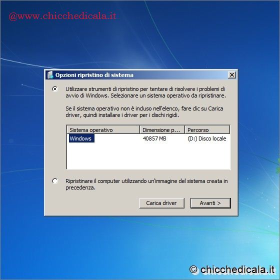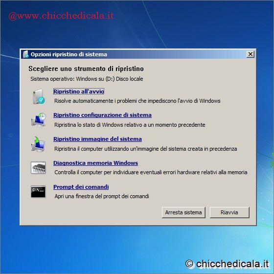 | 1. Nella schermata successiva dovete fare clic sul comando Ripristina il computer per caricare le applicazioni di ripristino. Anche in questo caso dovrete aspettare qualche minuto perché il computer cercherà nel disco le installazioni di Windows presenti. Se ne avete solo una (come nel nostro caso), selezionatela, annotatevi la lettera a cui fa riferimento il sistema (nel nostro caso la “D“) e fate clic su Avanti. 2. Una volta superata la selezione dell’installazione, apparirà la schermata che vedete in quest’immagine. Si tratta di un menu da cui potete scegliere cinque strumenti di diagnostica e ripristino del PC. In questo articolo vi abbiamo spieghiamo in dettaglio l’utilità di ciascuna di queste funzioni, ma in questo caso selezioniamo Prompt dei Comandi. | ||