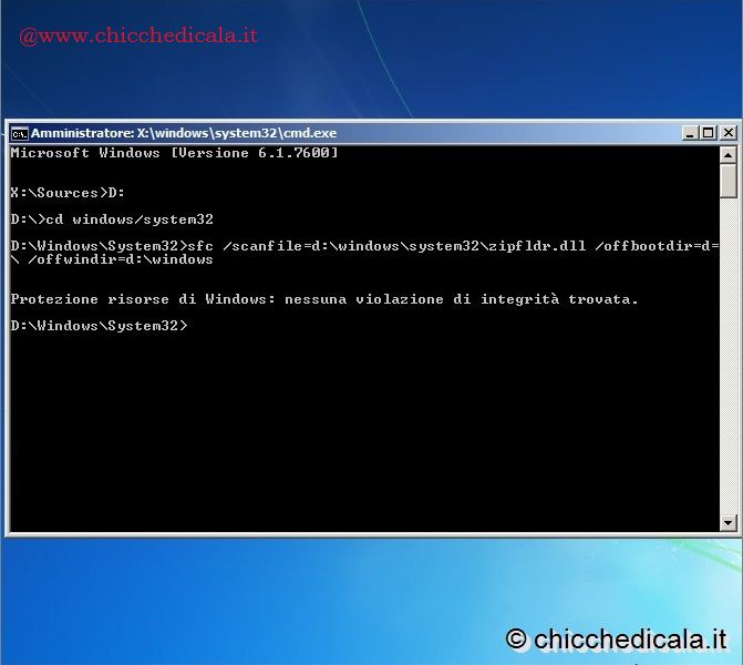 | 3. Per analizzare immediatamente tutti i file di sistema protetti e sostituire le versioni non corrette con quelle Microsoft corrette eseguire questo comando: sfc /scannow /offbootdir=d:\\ /offwindir=d:\\windows sfc /scanfile=d:\\windows\\system32\\zipfldr.dll /offbootdir=d:\\ /offwindir=d:\\windows NOTA: Il comando esegue la scansione del file Zipfldr.dll e lo sostituisce se necessario. | ||