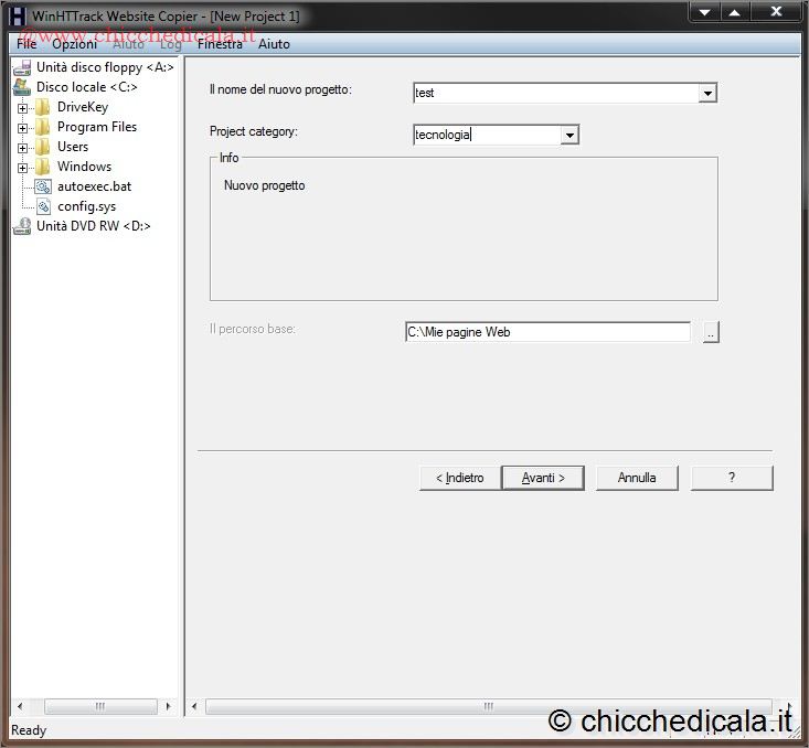 | 1. Per scaricare il programma WinHTTrack, collegatevi all’indirizzo Web (link in fondo). Spostatevi nella pagina Download, quindi procedete a scaricare il file di installazione del programma, del peso di 3,64 Mb. Al termine dello scaricamento, portate a termine l’installazione (verificate che la lingua sia impostata su “Italiano”). 2. Una volta avviato il programma, vi viene proposto immediatamente di iniziare un nuovo progetto. Dovete dargli un nome, e soprattutto impostare la cartella di riferimento del programma (in automatico impostata su “C:\\Mie pagine Web”). Lì verranno scaricati i vostri siti. Fate clic su Avanti. | ||