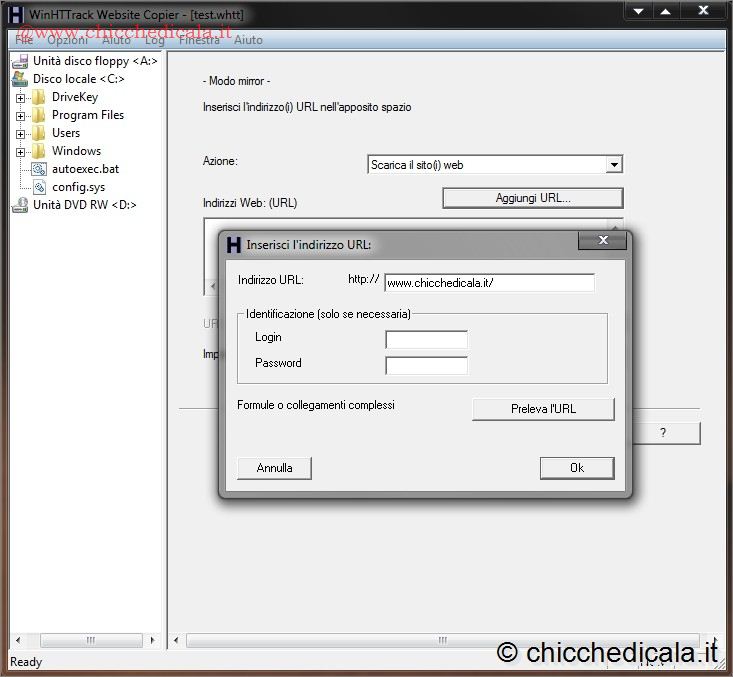 | 3. Nella pagina successiva, potete subito specificare l’indirizzo Web del sito (o dei siti) che volete scaricare sul vostro disco fisso. Per ogni sito verrà creata una nuova cartella all’interno di quella specificata al passo precedente. Fate ancora una volta clic su Avanti. 4. Il programma inizia subito il suo lavoro. L’operazione di download di un sito Web potrebbe richiedere parecchio tempo: alcuni siti, come dicevamo, sono composti da moltissimi livelli, e pesano anche diversi Mb (soprattutto se contengono parecchi contenuti multimediali, come immagini, video e così via). Al termine dell’operazione, l’intero sito potrà essere consultato semplicemente aprendo le pagine HTML che trovate nella cartella scelta al passo 2. | ||