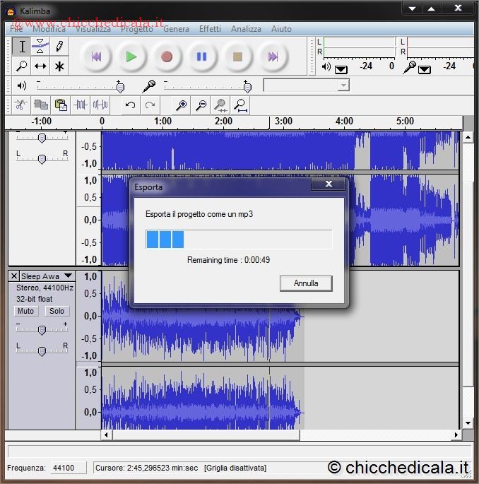 | 7. Selezionate il file, e confermate la scelta. L’esportazione del vostro nuovo MP3 ha inizio immediatamente. Audacity si ricorda, per le volte successive, l’ubicazione del codice LAME. 8. Audacity permette di eliminare alcune parti di un file audio. In due modi. Il primo consiste nel selezionare l’unica parte che volete conservare (trascinandoci sopra il mouse, tenendo premuto il tasto sinistro) e poi andando in Modifica/Elimina fuori della selezione. In tal modo si taglia tutto quello che non rientra nella selezione. Se invece volete semplicemente eliminare una piccola porzione di canzone e tenere tutto il resto, selezionate la parte in eccesso, quindi andate in Modifica/Elimina. In entrambi i casi, una volta ottenuto il risultato sperato, salvate il nuovo file andando in File/Esporta come MP3. | ||