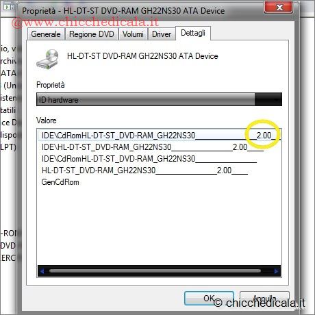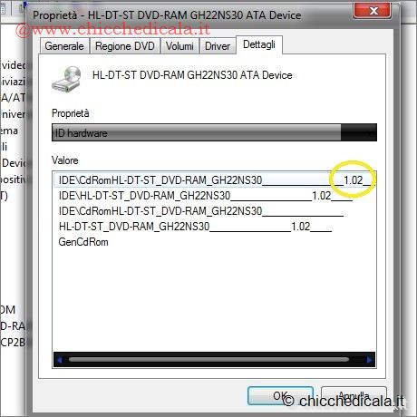 | 1. Per prima cosa, bisogna scoprire quale revisione di firmware monta il masterizzatore installato sul PC. Per fare questo, ci sono diversi metodi. Uno è di digitare “devmgmt.msc” nella casella di ricerca del menu Start o nel menu Esegui seguito da Invio. In questo modo aprirete la console “Gestione Dispositivo” (Gestione Periferiche per XP) quindi fare clic destro sul nome della periferica. Scegliere Proprietà e nella finestra che si apre selezionare Dettagli, quindi ID Hardware dal menu a scomparsa. La versione appare vicino al nome della periferica (vedi immagine). 2. Appurato che l’esemplare montato sul PC utilizza il firmware 1.02, è il momento di controllare sul sito Internet di LG se sono disponibili firmware più recenti per questo modello. Si va quindi sul sito di supporto del produttore e si cerca il software relativo al masterizzatore in questione. Nel caso di LG, lo si trova all’interno della categoria “Falsh Drivers”. E infatti, nella scheda “Optical Storage” il quarto modello citato è proprio il GH22NS30. | ||