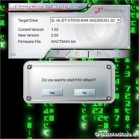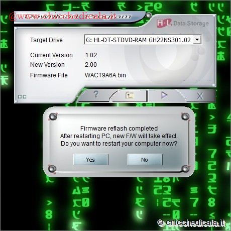| 7.Il programma segnalerà il trasferimento del firmware, poi l’operazione di “flashing” ovvero scrittura nella memoria avrà inizio. Dura qualche minuto, durante il quale è essenziale non spegnere o staccare nulla: se si interrompe a metà, il masterizzatore potrebbe non funzionare più. 8. Dopo qualche minuto, il programma informerà del successo dell’operazione e della nuova versione installata. Un clic su Yes chiuderà l’applicazione e riavvierà il PC per rendere effettive le modifiche. A quel punto il masterizzatore sarà aggiornato… almeno fino alla prossima versione del firmware. | ||