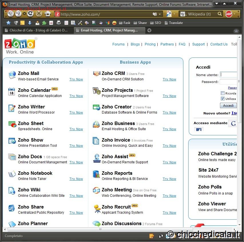| I software che comunemente utilizzate, dall’elaboratore di testi al foglio di calcolo, solitamente devono essere installati nel sistema, e risiedono sul disco fisso. La vera rivoluzione, e contemporaneamente la grande sfida di questi ultimi anni, è il tentativo di mettere a disposizione del pubblico dei programmi utilizzabili completamente on-line. Niente più installazione, né salvataggio sul disco fisso: tutto deve essere accessibile attraverso Internet. Allo stesso tempo, bisogna essere in grado di utilizzare i propri documenti ovunque ci si trova. Tra i vari protagonisti di questa corsa ai servizi software sul Web, oltre che al nuovo Office Web App e Google Documenti spicca il sito Zoho, che mette a disposizione un’intera suite di programmi per l’ufficio (e molto altro) da utilizzare direttamente in Rete. | ||