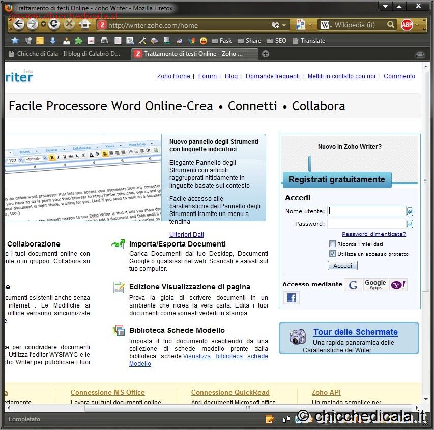 | 1. Come detto, Zoho Writer è un programma utilizzabile esclusivamente on-line. Non sarà necessario installarlo sul proprio computer. Per utilizzare il servizio, tuttavia, avrete bisogno di iscrivervi al sito. Una volta collegati aprite il sito www.zoho.com. Dopo pochi istanti, vi ritroverete nella pagina principale di Zoho. Come vedrete, in questo sito sono presenti molti programmi utilizzabili on-line. In questo caso concentratevi sull’elaboratore di testi. Per accedervi, fate clic su Zoho Writer. 2. Nella pagina successiva sono elencate le caratteristiche e potenzialità del programma. Per accedere al programma vero e proprio, però, dovrete iscrivervi al sito. Fate clic sulla scritta blu Registrazione Gratuita che appare sotto i due campi per il login. A questo punto dovere compilare un piccolo questionario per l’iscrizione. In alternativa è possibile effettuare l’accesso mediante un account Google, Yahoo o Facebook. Terminata la registrazione date un’occhiata alla vostra casella di posta e confermate l’iscrizione cliccando sul link presente. | ||