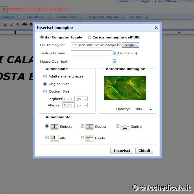 | 5. Provate ora a cambiare la dimensione del testo. Dopo averlo selezionato, fate clic sul menu a tendina alla destra di quello del tipo di carattere visto in precedenza. Inizialmente la dimensione è impostata su “10″. Provate a scegliere una dimensione superiore. Fate clic su “26″, per esempio. Selezionate nuovamente il testo e provate a premere le tre icone alla destra dei quattro campi nella barra degli strumenti. La prima icona, rappresentata da una B, applicherà lo stile grassetto. La seconda, rappresentata da una I inclinata, attiverà la funzione corsivo. La terza (una U sottolineata), sottolineerà le parole. Un ulteriore clic sulle stesse icone disattiverà l’opzione. 6. Alla destra delle icone viste in precedenza, troverete tutte le icone (identiche a quelle di Word) per allineare i testi. Da sinistra a destra le icone serviranno per allineare le parole a sinistra, al centro, a destra e giustificando il margine. Anche in Zoho, come in Word, potrete inserire tabelle e immagini nei vostri testi. Per inserire immagini, fate clic sull’icona Inserisci. Si aprirà un menu che permette di cercare sul vostro disco fisso e selezionare l’immagine da inserire nel testo. Fate clic sul tasto Sfoglia. A questo punto, per regolarne la dimensione utilizzate le opzioni Dimensione e allineate la vostra immagini dove meglio credete tramite le opzioni di allineamento. Cliccando su Inserisci: l’immagine verrà importata nel documento. | ||