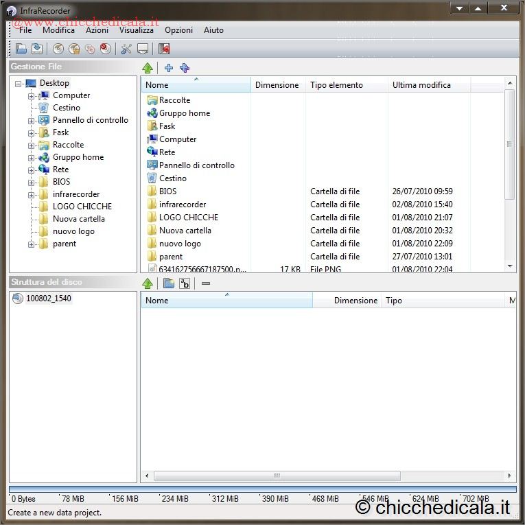 | 1. Scaricate il file di installazione (3,27 Mb) di InfraRecorder dal seguente indirizzo Internet. Il link Downloads si trova nella colonna di destra. Nella pagina successiva, scegliete laversione da scaricare. Fate doppio clic sul file eseguibile e procedete con l’installazione (durante la quale dovete scegliere la lingua italiana). 2. Come potete osservare, l’interfaccia di InfraRecorder è molto simile a Esplora risorse di Windows. Al suo primo avvio, il programma si presenta con quattro riquadri. Nella parte superiore è presente il contenuto del disco fisso, in quella inferiore il contenuto del CD o DVD che volete creare. La barra che si trova nella parte inferiore della finestra indica quanto spazio del disco vergine verrà occupato dai file che intendete masterizzare. | ||