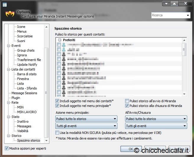 | 9. Miranda IM salva su disco tutte le vostre conversazioni, cosa che per qualunque motivo può non farvi \t\tparticolarmente piacere. Per risolvere questo inconveniente, dovete scaricare il plug-in “History Sweeper” a questo indirizzo. Si tratta di un file compresso, da cui dovete estrarre il file “Historysweeper.dll” (che andrà copiato nella cartella Plugins). A questo punto avviate Miranda IM, passate alla finestra Opzioni e spostatevi alla voce Plugins, in cui dovete mettere un segno di spunta sulla casella corrispondente al plug-in indicato. 10. Le finestre di configurazione dei plug-in (o almeno di quelli che ne prevedono una) si trovano sotto la voce Plugins, sulla sinistra di quest’area di lavoro. La finestra delle opzioni di History Sweeper, in particolare, aggiunge una voce Storico e permette di configurare molti aspetti di questo plug-in. | ||