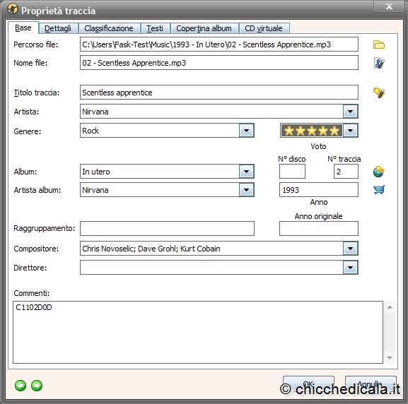| 7. Finora abbiamo visto come gestire i file in cui le informazioni di esecuzione sono bell’e pronte. Ma, ahinoi, non è sempre così. Spesso nei file le informazioni memorizzate sono frammentarie o scritte male, o scritte nei campi sbagliati: in questi casi, la catalogazione dei brani è pressoché impossibile. Per esempio, scaricando brani dal Web, spesso ci si ritrova poi con il titolo dell’album e il nome dell’autore memorizzati all’interno del titolo del brano, magari anche con il numero di sequenza del brano. Un tale “disordine” fa sì che, se trasferite i file su un lettore portatile, questo non riesca a ordinare in modo automatico album e collezioni. A meno che non si utilizzi al meglio MediaMonkey. 8. Tutti i principali programmi per ascoltare i file audio permettono anche di modificare le informazioni dei tag ID3 di ciascun brano. Anche MediaMonkey: basta selezionare un singolo brano e premere la combinazione di tasti SHIFT+INVIO. Nella finestra che si apre si possono scrivere tutti i dati necessari a catalogare un brano: Titolo, Artista, Titolo dell’album, Numero del brano (nell’ambito dell’album stesso) e tanto altro. | ||