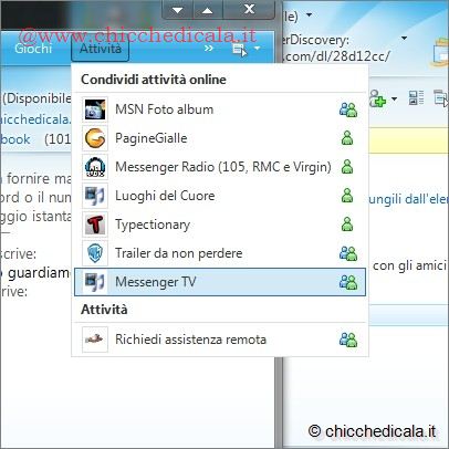 | 1. Per avviare la Messenger TV dobbiamo \tinnanzitutto loggarci a Windows Live Messenger e iniziare una conversazione con uno dei nostri contatti, cliccando due volte sul suo nome. Dopo averlo avvisato delle nostre intenzioni, clicchiamo sul tasto Condividi attività on-line e poi su Messenger TV. 2. Verrà inoltrata una richiesta al nostro contatto, per avviare anche sul suo Messenger il servizio di TV condivisa. Quando il contatto accetta la richiesta, a destra della finestra di chat si apre automaticamente un nuovo pannello. Lì dentro verranno caricati gli strumenti di controllo di Messenger TV. | ||