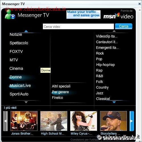 | All’interno di Live Messenger, è disponibile una nuova funzionalità che consente di guardare programmi TV scelti da un ricco palinsesto. Accedendo a Messenger TV possiamo così sfogliare tra i canali disponibili, che trasmettono telegiornali con notizie dell’ultima ora, contenuti realizzati da Mediaset ed MTV (con gli spettacoli più noti) nonché eventi di carattere musicale prodotti da case discografiche quali Sony BMG. Insomma, grazie a questa funzione possiamo guardare i programmi TV preferiti e commentarli con gli amici via chat, ovunque essi siano, a patto ovviamente di avere a disposizione un computer collegato ad Internet. | ||