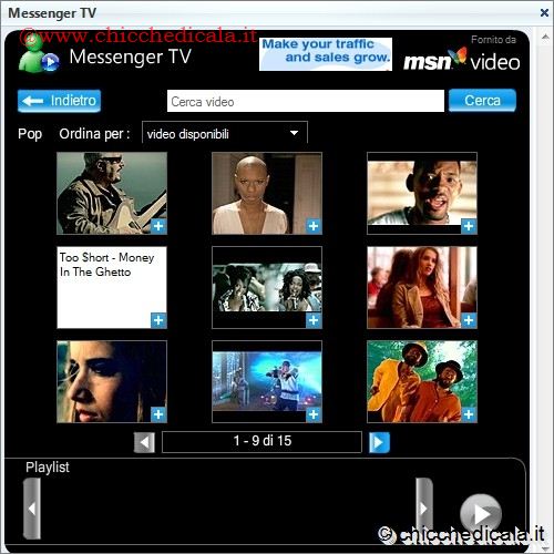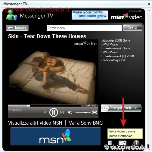 | 5. Clicchiamo in basso a destra sul tasto Riproduci per avviare la lista dei filmati impostata in precedenza. I video si susseguiranno all’interno di una schermata di riproduzione ingrandita. Come ogni TV che si rispetti, non manca la pubblicità; ma è proprio questa che rende il tutto gratuito! Al termine, per “spegnere” la TV basta chiudere la finestra di chat. 6. Se vogliamo che l’evento televisivo a cui stiamo assistendo sia reso disponibile anche ad amici che non hanno Live Messenger, basta cliccare in basso a destra del filmato sul simbolo Invia video tramite posta elettronica. Verrà composto un messaggio che riporta il link al filmato. | ||