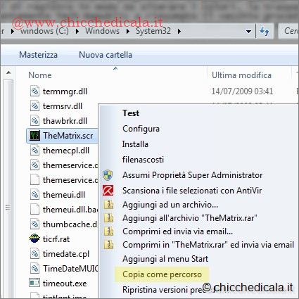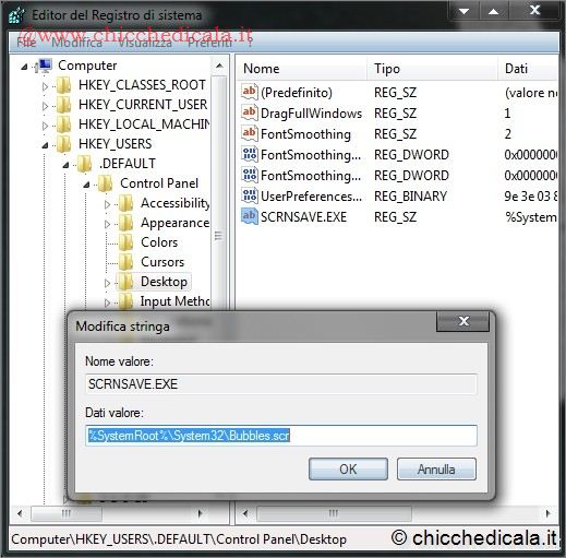 | 1. Premiamo contemporaneamente i tasti WIN + R, digitiamo Esegui e premiamo Invio. Nella finestra Editor del Registro individuiamo la chiave HKEY_USERS\\.DEFAULT\\Control Panel\\Desktop e focalizziamo la nostra attenzione sulla parte destra della finestra. Cliccando con il tasto destro del mouse su uno spazio vuoto selezioniamo Nuovo/Stringa nominandola SCRNSAVE.EXE. Con un doppio clic sulla stringa appena creata inseriamo il percorso completo dello screensaver desiderato (es: C:\\Windows\\System32\\Bubbles.scr). NOTA: Per impostazione predefinita tutti gli screensaver si trovano nella cartella %SystemRoot%\\System32 e prendono il nome di: Bubbles.src, Mystify.src, Ribbons.scr e ssText3d.src. 2. Inoltre è possibile impostare screen saver personalizzati. Scarichiamo, ad esempio TheMatrix.zip ed estraiamo il contenuto. Posizioniamo il file TheMatrix.scr in %SystemRoot%\\System32 e tenendo premuto il tasto Shift clicchiamo con il tasto destro sul medesimo. Selezioniamo l’opzione Copia come percorso nel menu contestuale e incolliamo il percorso nei Dati Valore della stringa SCRNSAVE.EXE creata al passo precedente. | ||