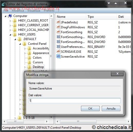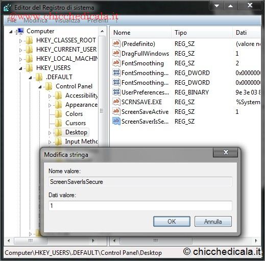 | 3. Creiamo un Nuovo/stringa nominandola ScreenSaveActive e con un doppio clic modifichiamo i Dati Valore a 1. \t\t 4. Creiamo un Nuovo/Stringa nominandola ScreenSaverIsSecure e con un doppio clic modifichiamo i Dati Valore a 1. | ||