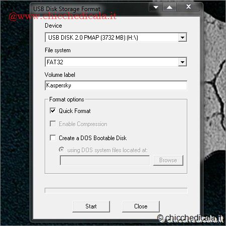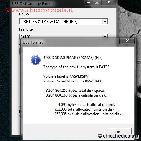 | 1. Scompattiamo l’archivio Usb disk storage format.rar sul desktop, colleghiamo al personal computer la chiavetta USB ed avviamo “usb_disk_storage_format.exe” come amministratori accertandoci che nella casella “Device” sia indicato proprio il nome della chiave USB in uso. 2. Dal menu a tendina “File System” selezioniamo “FAT32” e in “Volume Label” assegniamo un nome al dispositivo. Successivamente spuntiamo la casella “Quick Format“ e clicchiamo sul pulsante “Start“. Confermiamo l’operazione cliccando sul pulsante “SI” e attendiamo che l’utility provveda a formattare la PenDrive col file system corretto. | ||
