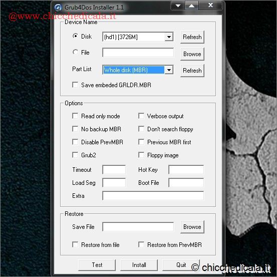 | 3. Scompattiamo l’archivio Grub4Dos.rar sul desktop e avviamo, come amministratori, l’eseguibile “grubinst_gui.exe”. Spuntiamo l’opzione “Disk“, clicchiamo sul pulsante Refresh e selezioniamo la nostra chiavetta USB dal menu a tendina. In “Part List” clicchiamo sul pulsante Refresh e selezioniamo “Whole disk (MBR)” e clicchiamo il pulsante “Install“. 4. Dalla finestra DOS premiamo il tasto Invio per continuare e successivamente il pulsante Quit per uscire da Disk Storage Format Tool. | ||