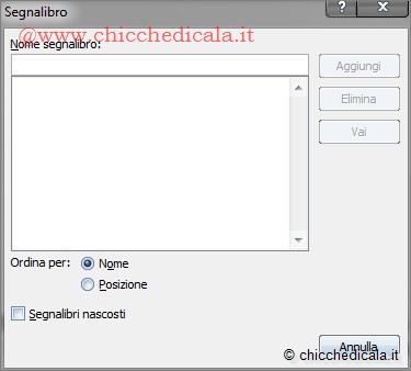 | 1. Per aprire la finestra dedicata ai Segnalibri, dalla barra dei menu, fate clic su Inserisci/Segnalibro. 2. La finestra di dialogo Segnalibro serve per gestire i segnalibri all’interno del documento Word. Qualora fossero già presenti dei segnalibri all’interno del testo, ne vedreste l’elenco qui. Nel nostro caso l’elenco è vuoto. | ||