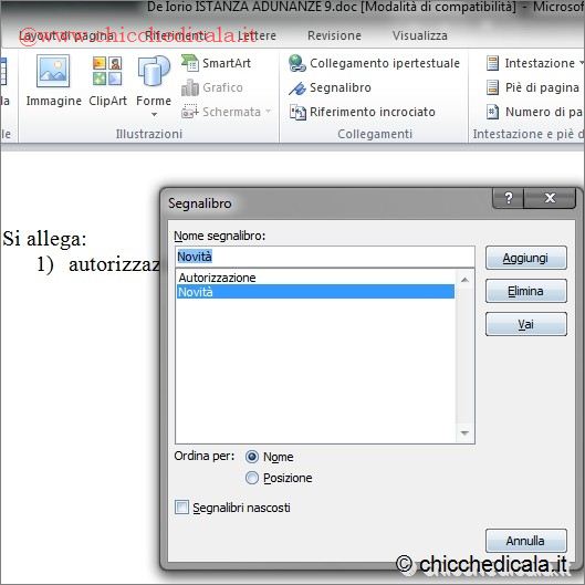 | 3. Per aggiungere un “Bookmark” a un documento, selezionate un elemento oppure fate clic nel punto in cui si desidera operare. A questo punto scegliete Inserisci/Segnalibro, come visto al passo precedente. Nella casella Nome segnalibro, inserite un nome. Fate attenzione, perché i nomi devono avere determinate caratteristiche: devono iniziare con una lettera e possono contenere dei numeri, non sono ammessi gli spazi. Per separare tra loro le parole è possibile utilizzare il carattere di sottolineatura, per esempio “Prova_segnalibro”. Una volta scelto il nome, fate clic su Aggiungi. 4. Vi potete posizionare su un segnalibro specifico. Dalla barra dei menu di Word, scegliete Inserisci/Segnalibro e, nella finestra che appare, potete ordinare i segnalibri dell’elenco per nome o per posizione, mettendo un segno di spunta sulla modalità desiderata. È possibile visualizzare anche quelli nascosti (per esempio i riferimenti incrociati): basta selezionare la casella di controllo omonima. All’interno della cartella di gruppo “Nome segnalibro”, dovete selezionare quello a cui siete interessati e fare clic sul pulsante Vai. | ||