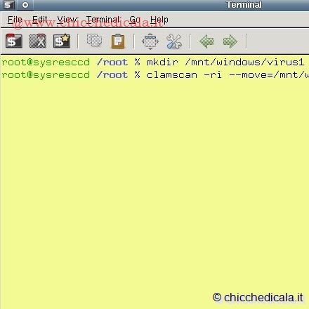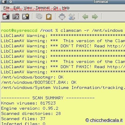 | 7. A questo punto diamo il comando clamscan -r /mnt/windows per effettuare la scansione della partizione indicata nel passo precedente. Al termine, nella finestra di Terminale compariranno alcune righe di testo. Quella che ci interessa è Infected files, seguita da un numero: se questo è “O” vuoi dire che non sono stati rilevati virus. 8. Se invece Infected file contiene il valore 1 o maggiore, dobbiamo spostare i file con i virus. Creiamo la directory in cui spostarli con mkdir /mnt/windows/virus. Poi diamo il comando clamscan -ri --move=/mnt/windows/virus /mnt/windows. Per rimuovere l’infezione basterà quindi cancellare la directory con rm /mnt/windows/virus. | ||