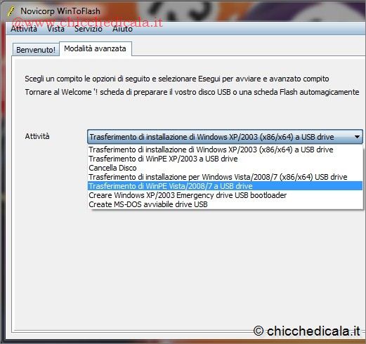 | 1. La procedura di trasferimento dei file prevede la formattazione della chiavetta USB, Ciò vuoi dire che tutti i dati in essa contenuti verranno eliminati definitivamente. Prima di iniziare la procedura, quindi, assicuriamoci di avere effettuato un backup completo dei file più importanti. WinToFlash non richiede installazione. Basta estrarre il file wintoflask.zip e fare doppio clic su WinToFlash.exe. Caricato il software, andiamo nelle impostazioni e selezioniamo la lingua italiana. A tal fine, da Service/Option scegliamo la lingua italiana. 2. Clicchiamo su Modalità Avanzata e dal menu a tendina scegliamo la versione di Windows che vogliamo \t\ttrasferire sulla chiavetta USB da 4 GB (che, ovviamente, dobbiamo collegare al PC in uso). Nel caso di Windows Vista o Seven dobbiamo selezionare Trasferimento di WinPE Windows Vista/2008/7 a USB Drive. Fatto ciò, clicchiamo su Correre. | ||