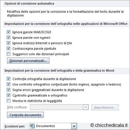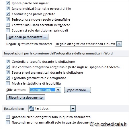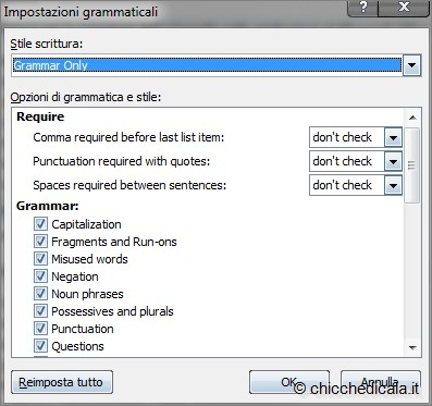 | 9. Se ritenete insufficienti le correzioni offerte dal programma potete modificare qualche impostazione facendo clic su File/Opzioni. Nella sezione Strumenti di correzione, in corrispondenza di Stili scrittura, scegliete dal menu a tendina lo stile di correzione che preferite. 10. Altrimenti fate clic su Impostazioni e scegliete gli elementi che volete siano segnalati come errore grammaticale. Attenzione: le indicazioni sono nella lingua selezionata, quindi non stupitevi se le trovate in inglese. | ||