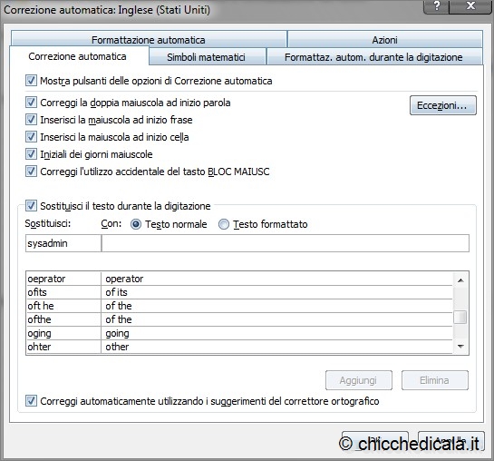 | 3. Per verificare se la modifica è stata accettata dal programma, procedete come segue. Se avete selezionato del testo come indicato al passo 1 non spostate il cursore del mouse dal testo. Fate clic ancora su File/Opzioni, spostatevi nella sezione Strumenti di correzione e selezionate la voce Opzioni correzione automatica. verificate che siano indicate delle parole inglesi nella sezione dedicata alla sostituzione automatica delle parole. Se ci sono ancora parole in lingua italiana ripetete il passo 2. Fate clic su Annulla per uscire dalla finestra. 4. Un’altra importante verifica da fare è quella di scrivere delle parole in inglese volutamente sbagliate: se Word fosse impostato in modo corretto, le parole sbagliate dovrebbero essere sottolineate in rosso. Se accade, seguite le istruzioni del passo 8. Se non accade, fate clic su File/Opzioni. Fate clic sulla scheda Strumenti di correzione e verificate che siano selezionate le voci Controlla ortografia durante la digitazione e Segna errori grammaticali durante la digitazione. Fate clic su OK per confermare la selezione e tornate al documento. Se la sottolineatura rossa non appare sotto le parole inglesi sbagliate, significa che il correttore ortografico per l’inglese non è stato installato. | ||