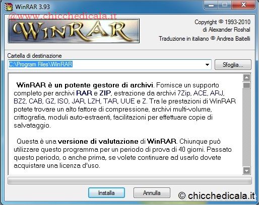 | Quando si ha a che fare con file compressi, la maggior parte degli utenti pensa subito a software come WinZip o alla funzionalità “Cartelle Compresse” presente all’interno di Windows. Tuttavia esiste un programma alternativo e decisamente valido: WinRAR. Si tratta di un software shareware; dopo il periodo di valutazione di 40 giorni, dovrete registrare la vostra copia. Nonostante questo è possibile utilizzarlo anche dopo tale periodo con la limitazione di un piccolo banner ad ogni avvio del programma. Una delle migliori caratteristiche di WinRAR è la funzionalità che consente di dividere gli archivi in parti più piccole, per semplificarne l’invio con la posta elettronica o il download via Internet. Vediamo in questo articolo come scaricarlo, installarlo e iniziare a utilizzarlo. | ||