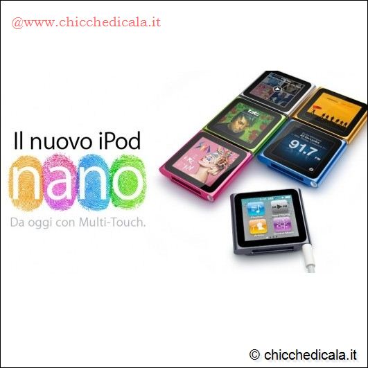 | 3. La Apple come ogni anno aggiorna tutti i suoi prodotti, ed infatti ha presentato il nuovo iPod Shuffle, più piccolo che mai, presenta un’interfaccia molto pratica, ed un design quadrato. In America verrà venduto a 99 $. 4. L’azienda di Cupertino non si è fermata ed ha introdotto anche la nuova generazione di iPod Nano. Questa nuova generazione, presenta uno schermo Touch Screen, e una dimenensione molto ridotta in quanto è stato lasciato solo schermo Touch. Presenta le stesse funzioni classiche dell’iPod Nano, ed è basato su iOS. | ||