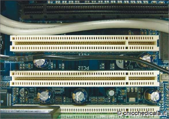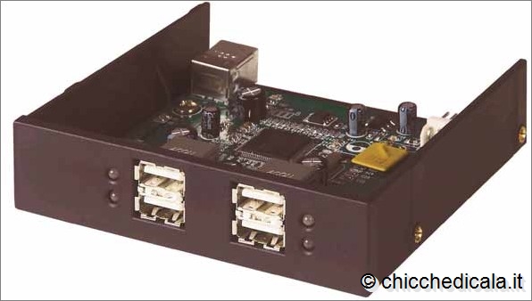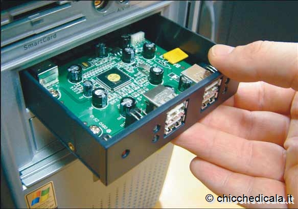 | 3. Avrete bisogno di una porta PCI libera, nella quale inserire l’hub. Fate riferimento alla foto per riconoscere le porte PCI. Aprite l’eventuale lastra di metallo che chiude il retro del case, altrimenti le nuove porte USB non saranno accessibili dall’esterno. Prendete la scheda, tenendola per gli angoli ed evitando di toccare i connettori metallici alla base, e inseritela nella porta PCI. Potrebbe essere necessario fare un po’ di forza, ma cercate di non esagerare. Fissate la scheda utilizzando la vite (se il case prevede questa possibilità) e richiudete il computer. Una volta acceso il PC, Windows dovrebbe riconoscere il nuovo hardware e guidarvi nell’installazione del nuovo dispositivo. NOTA: Per maggiori dettagli sull’installazione di periferiche PCI potete seguire questa procedura. 4. L’ultima soluzione è, forse, anche la più elegante: installare un hub USB all’interno di uno scompartimento per i drive, sul lato anteriore del PC. Il costo è leggermente più alto, ma il risultato è decisamente più pratico. Per poter scegliere questa via, deve essere presente nel PC un connettore interno USB. Inoltre ricordatevi, prima di acquistare l’hub, di controllare che ci sia uno scompartimento libero nel case. Per installare l’hub, spegnete il PC e aprite il case rimuovendo le viti dal retro o eventuali altri blocchi. | ||