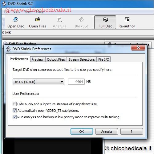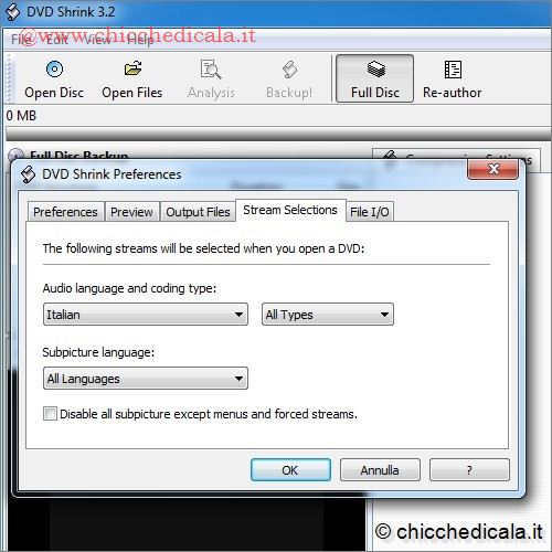 | 3. Sempre nella finestra delle preferenze, spostatevi nella scheda Stream selections. Qui potete indicare la lingua preimpostata per le tracce audio e per i sottotitoli. Il programma, come vedremo, offre la possibilità di non copiare alcuni dati (per esempio le lingue che non vi servono) per risparmiare spazio. 4. A questo punto tornate nella finestra principale di DVDShrink. Dopo aver inserito il DVD originale nel lettore del PC, fate clic su Open disc, come mostrato in figura. Invece, nel caso in cui abbiate sul disco fisso i file di un DVD, premete il pulsante accanto, vale a dire Open Files. | ||