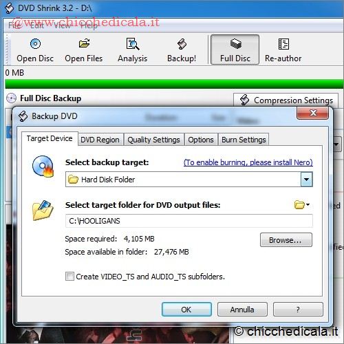 | 9. Fatte le vostre scelte, fate clic sul pulsante Backup che si trova nella barra principale del software. Si apre la finestra Backup DVD. Nella scheda Target device dovete stabilire dove salvare i file estratti dal disco originale. Scegliete Hard disk folder per copiarli sul disco fisso, in una cartella che dovete indicare facendo clic sul tasto Browse. Fate clic su OK. 10. Si avvia la procedura di copia e, contemporaneamente, di compressione dei dati. Questa dura parecchi minuti, a volte anche un’ora. Dipende dalla quantità di dati, dal livello di compressione e dalla potenza del vostro processore. Anche in questo caso, come al passo 6, potete veder scorrere le immagini del DVD in anteprima. A questo punto, masterizzate i file copiati sul disco fisso utilizzando il vostro programma di scrittura preferito o utilizzando InfraRecorder Portable come spiegato in questo articolo. | ||