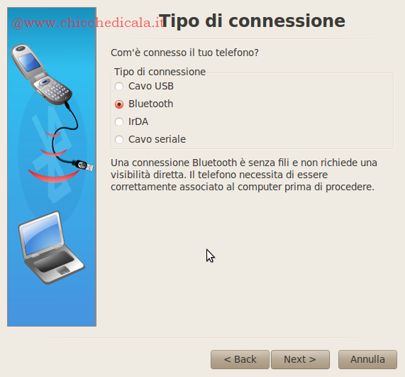 | 3. Ci vengono proposte tre possibili scelte. Scegliamo di far partire la configurazione guidata. 4. A questo punto dobbiamo indicare come il telefono è connesso al computer. Nel nostro caso Bluetooth. Andiamo avanti | ||