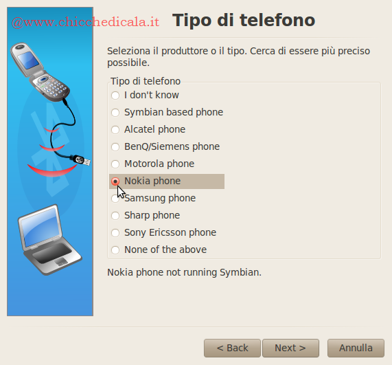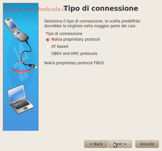 | 5. Il wizard ci chiederà la marca del nostro cellulare (in questo caso un nokia). 6. In base alla scelta precedente, ci verrà chiesto di scegliere quale protocollo utilizzare per comunicare per il telefono. A meno che non abbiate buoni motivi, il default ci permeterrà di sfruttare al meglio le possibilità del telefono | ||