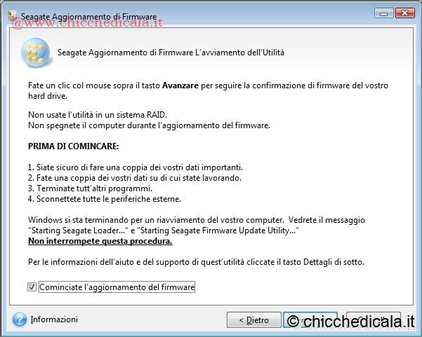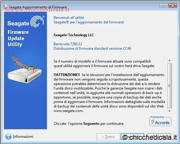 PRIMA DI INIZIARE E’ MEGLIO SAPEREPer mettere in pratica quanto spiegato nell’introduzione, procederò all’aggiornamento del firmware di un diffuso modello di hard disk: il Seagate ST3500418AS. La procedura è molto simile per tutti i produttori quindi niente paura. Va ricordato che se le istruzioni per l’installazione dell’aggiornamento del firmware non vengono eseguite scrupolosamente, questa operazione potrebbe determinare la distruzione dei dati o rendere l’unità disco inutilizzabile. Per evitare spiacevoli sorprese la redazione consiglia di eseguire con la clonazione del disco fisso. In tal modo, in caso di problemi sarà possibile ripristinare le impostazioni predefinite. NOTA: Clicca sulle immagini per visualizzarle a grandezza naturale | ||